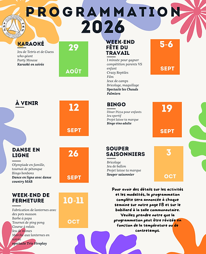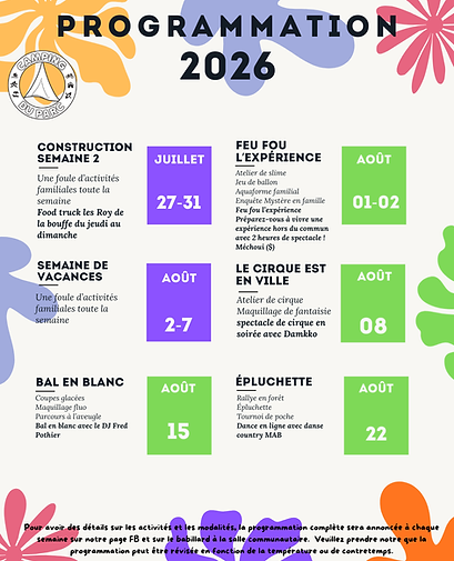 Nous avons une animatrice qui anime des activités la plupart des fins de semaine de mai à octobre pour les enfants et les familles ainsi que certaines semaines pendant l'été. Pour plus de détails des activités, les inscriptions, des dates, lieux et heures où se dérouleront celles-ci, visitez notre page facebook à toutes les semaines ainsi que notre babillard à la salle communautaire :). En tout temps peu importe les activités, nous préservons la quiétude des campeurs :)